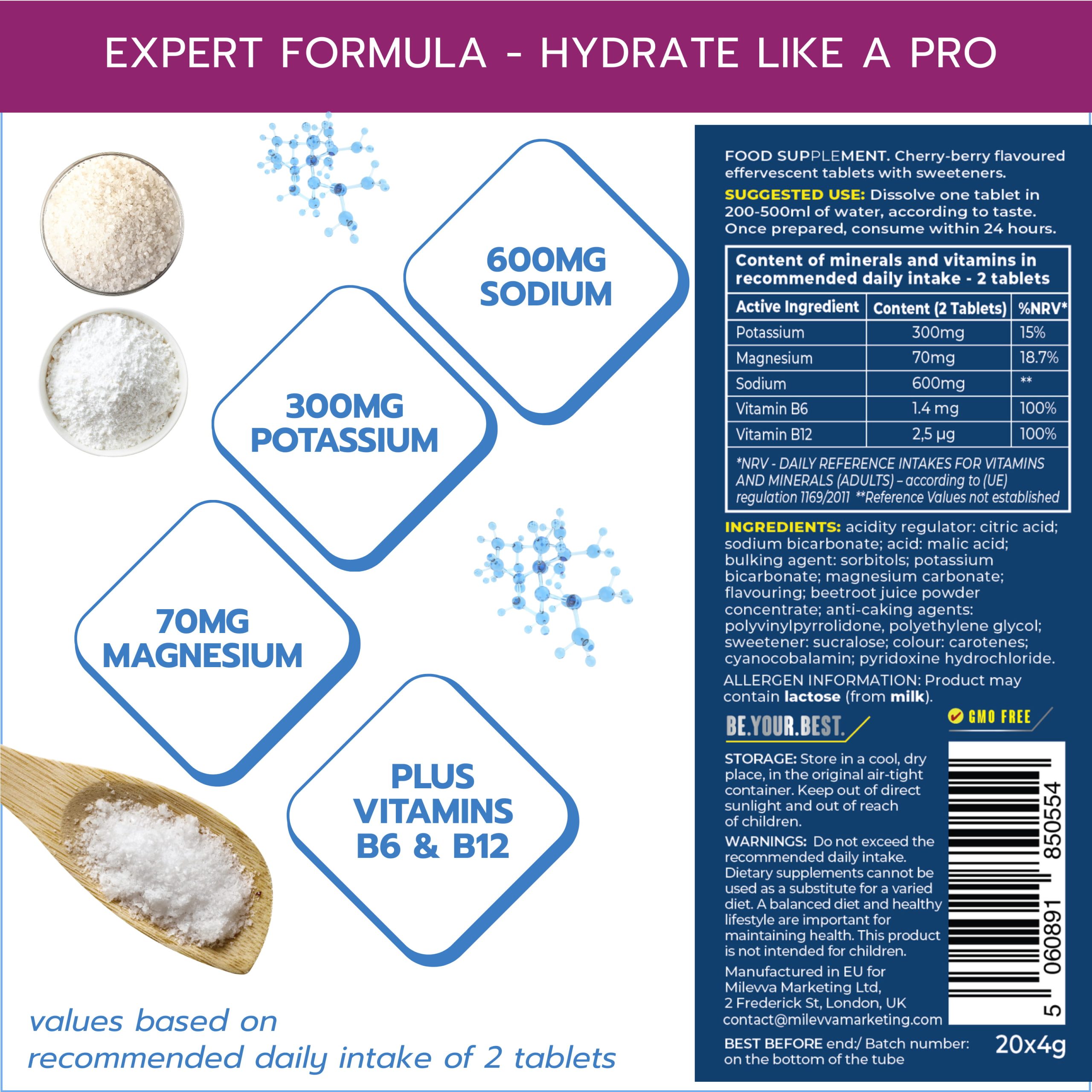 ingredients Acidity regulator: citric acid; sodium bicarbonate; acid: malic acid; bulking agent: sorbitols; potassium bicarbonate; potassium chloride; magnesium carbonate; flavouring; beetroot juice powder concentrate, anti-caking agents: polyvinylpyrrolidone, polyethylene glycol; sweetener: sucralose; colour: riboflavins; cyanocobalamin; pyridoxine hydrochloride.